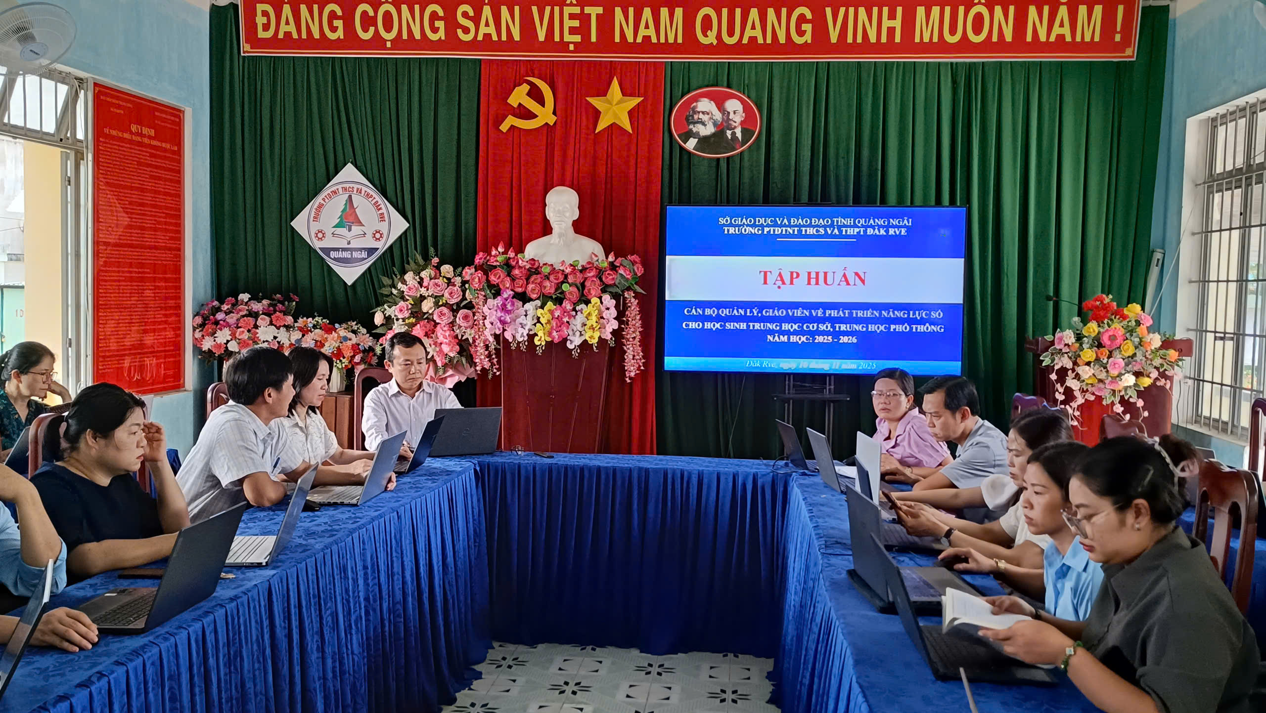 Thực hiện Kế hoạch số 294/KH-SGDĐT ngày 23 tháng 10 năm 2025 của Sở GDĐT tỉnh Quảng Ngãi về tập huấn phát triển năng lực số cho học sinh trung học cơ sở, trung học phổ thông. Vào ngày 10 tháng 11 năm 2025 trường PTDTNT THCS và THPT Đăk Rve tổ chức tập huấn cho đội ngũ cán bộ quản lý, giáo viên trong toàn trường về phát triển năng lực số cho học sinh.